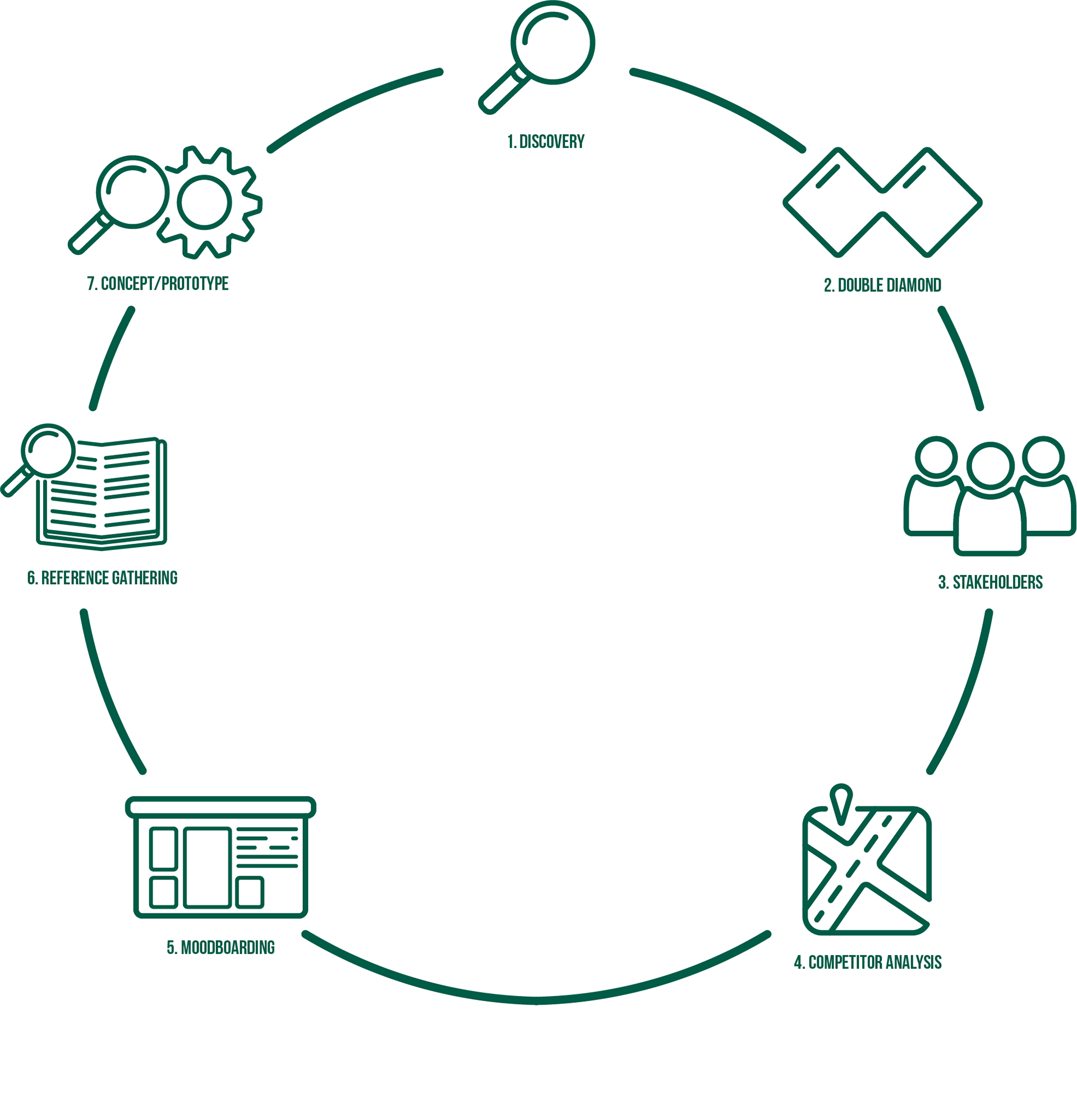 Each project follows a clear sequence: understanding the context, defining the challenge, exploring possibilities and converging towards a well-founded concept. Afterwards we circle back for feedback and either go through the process again or deliver.